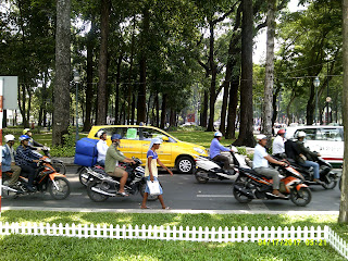 Saigon has 13 million people, and 7.5 million motorcycles. If you have to superficially sum up this city that might be it. For a foreigner, the primary skill you must learn for a short visit is how to cross the street. On the main thoroughfares, waiting for a break in the traffic is pointless. There are traffic lights, but, (with one or two exceptions I have seen) there are no yellow lights and everyone starts about five seconds before the light changes anyway. So you just have to walk in front of the speeding motorcycles, buses, and occasional cars, and never look at the drivers and riders - you can’t hesitate. Hesitation can be fatal. They are timing their moves based on you maintaining a predictable pace and direction. And of course if you can join up with a group, that always seems to give you a better chance of making it to the other side of the road. Saigon is a city you can see most of (for the short 3-5 day visit) on foot.